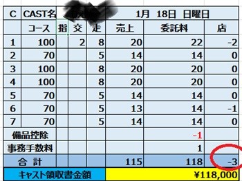 ◆右端の赤丸-3000円は、お店からキャストさんに対する交通費2000円